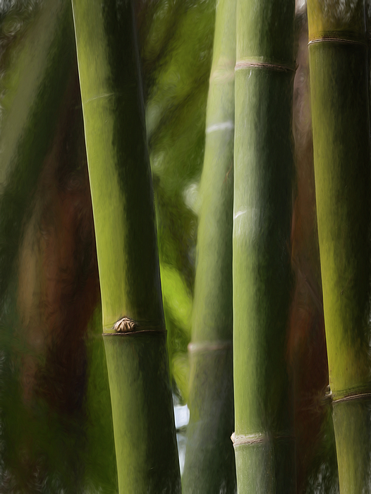 Tall bamboo stalks stand closely together, their smooth green surfaces catching the light. The background is a mix of blurred foliage, creating a... more