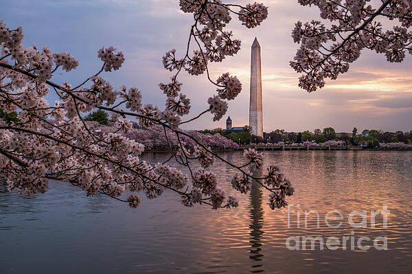 This breathtaking image of the Washington Monument framed by cherry blossoms at sunrise is a timeless tribute to spring’s arrival in the nation’s capital. The soft pastel sky, golden reflection in the Tidal Basin, and delicate blooms create a scene both peaceful and iconic—perfect for collectors of fine art photography.