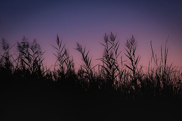 Tall, slender grasses stand silhouetted in elegant stillness, their delicate forms etched against a sky that shifts from soft pink to deep, velvety... more