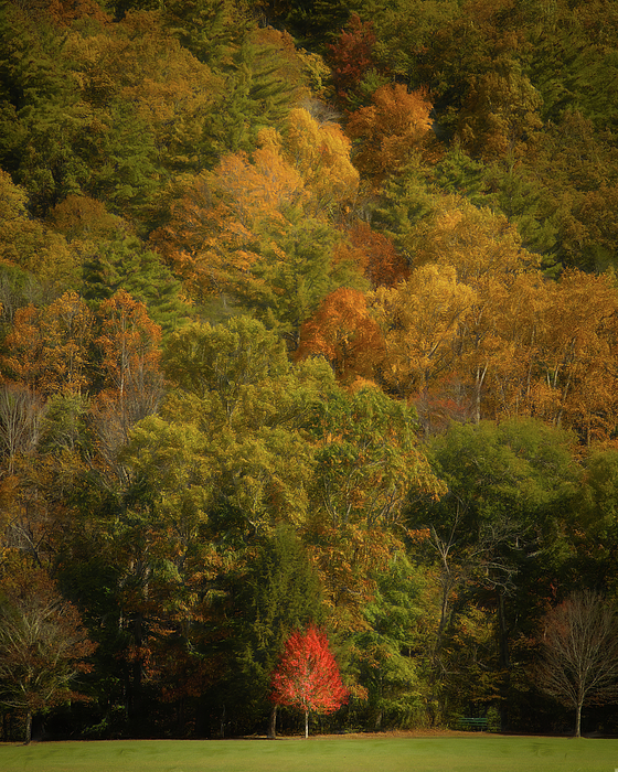 A dense forest with a variety of trees in autumnal hues showcases a captivating blend of greens, yellows, and reds. In the foreground, a solitary... more