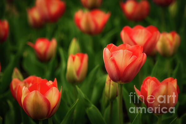 In this quiet garden, tulips unfold like painted flames—blush pinks and rich corals shimmering against a lush backdrop of green. A fleeting... more